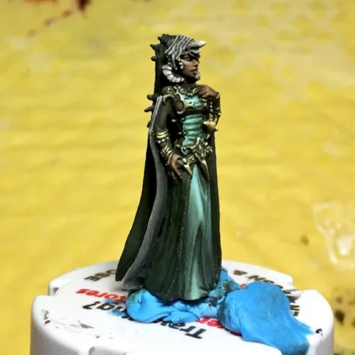 Last but not least, I have Reaper's Cleric of Mammon where I've taken some artistic liberties with her clothing and skintone paint choices which differs from her concept art (below right). While the Erza Scarlet-inspired mini above will have a fair skintone, I often challenge myself to experiment with darker shades. I'll be incorporating my examples into a future class at ReaperCon 2018!