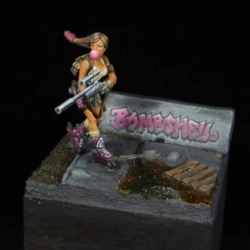 I had a lot of fun with this! I researched different “graffiti alphabets” and chose a style I thought would translate well on a miniature scale. I cut a smaller piece from a Reaper “Jersey Barrier”, to mimic a concrete traffic barrier you often see in the cities, dividing opposing highway lanes without grassy medians.